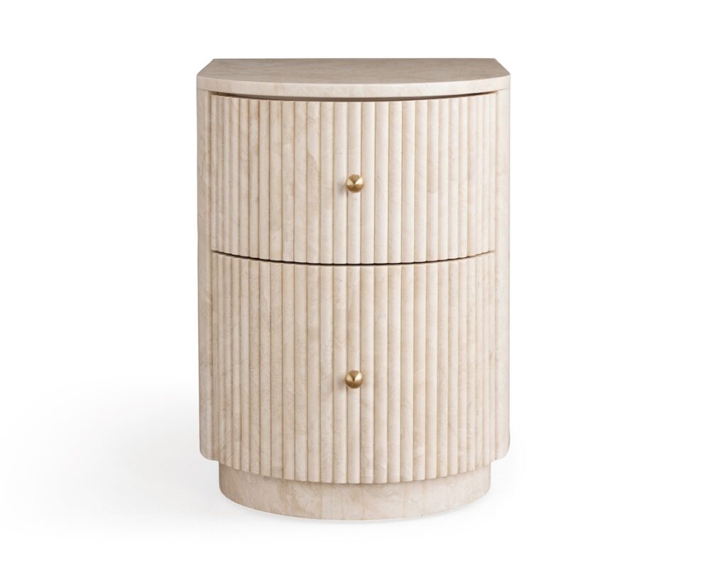 Furniture made from rocks can lean a little Flintstones. Not here, though. The scalloped curves and shiny finish of this charming little nightstand coax an unexpected softness and romance out of natural stone.